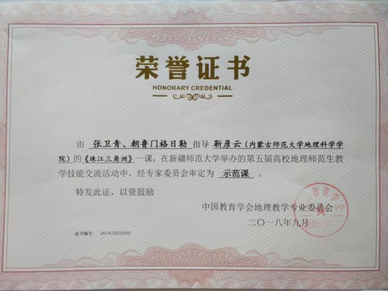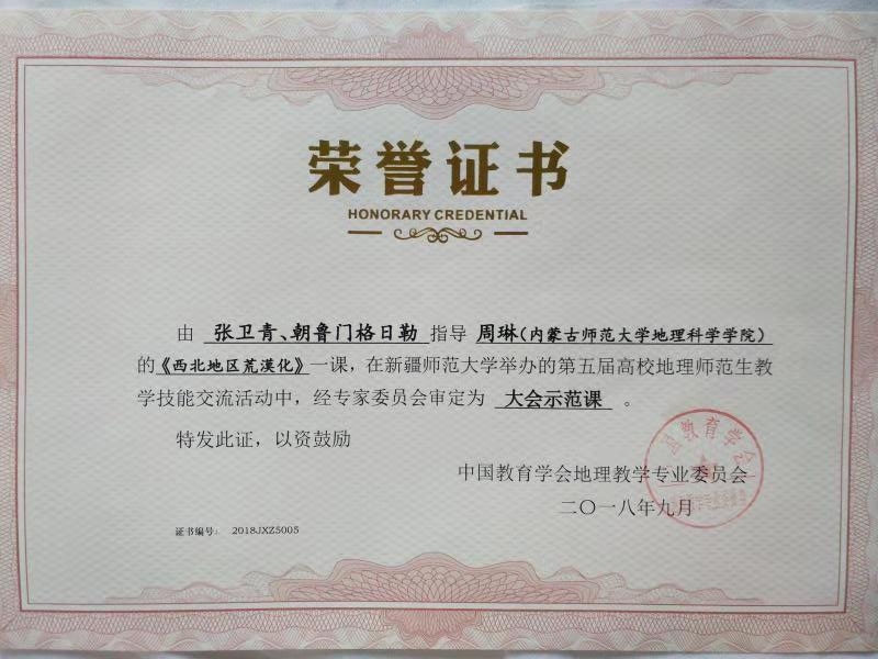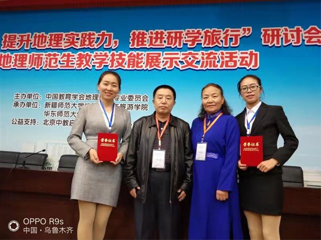 由中国教育学会地理教学专业委员会主办, 新疆师范大学和华东师范大学承办的全国第五届高校地理师范生教学技能大赛于9月30日在乌鲁木齐落下帷幕。本次大赛全国共有71所高校的112名本科生和37名研究生参赛。我校共有2位选手参赛,均在比赛中取得优异成绩。由张卫青教授和朝鲁门副教授指导的地理科学学院2017级学科教学(地理)专业研究生周琳同学获得 “大会示范课奖”并在大会现场进行展示;2017级学科教学(地理)专业研究生靳彦云同学获得“示范课奖”。