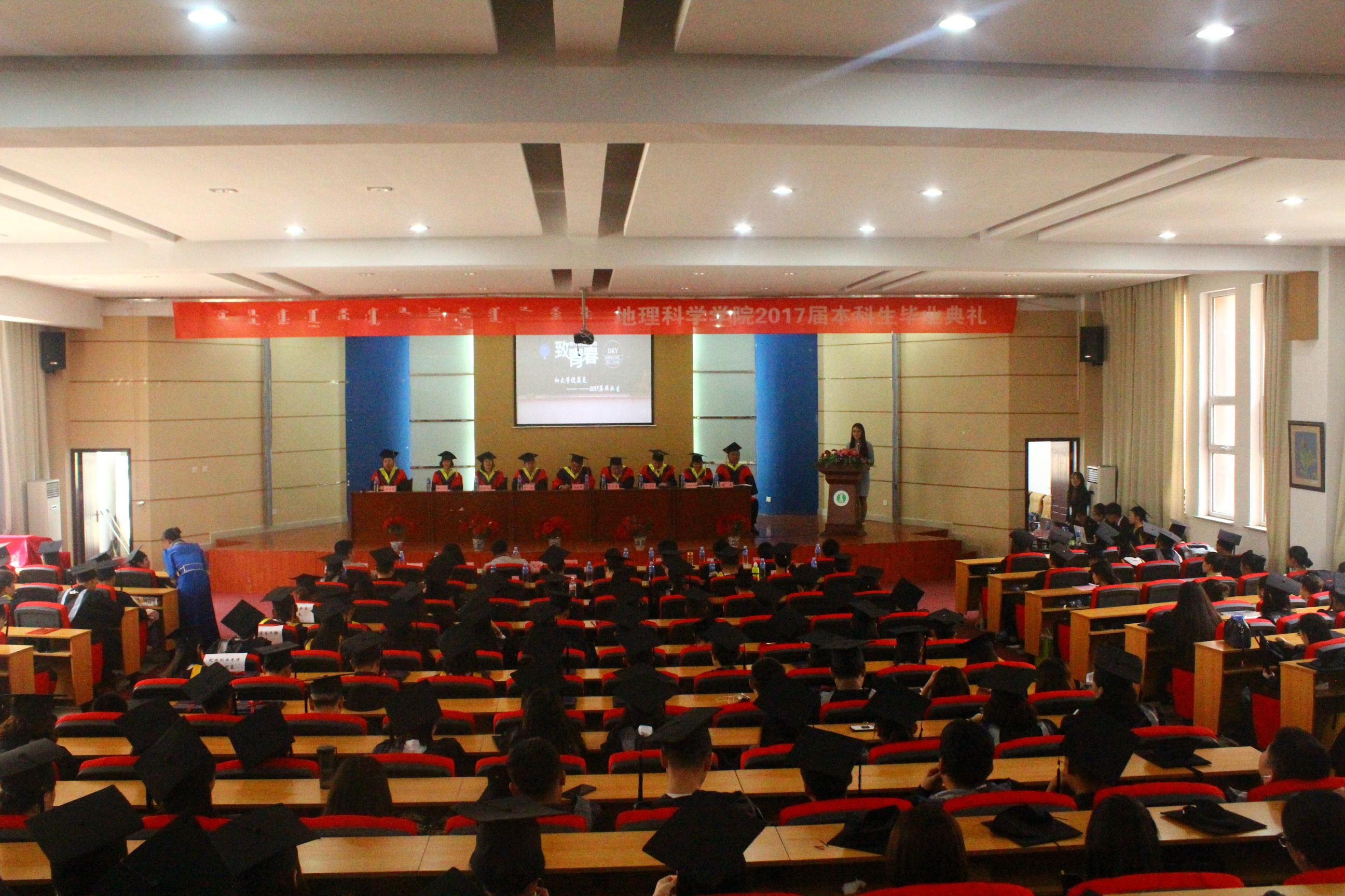 典礼由党总支副书记李雨薇老师主持。在庄严的国歌声中,典礼正式开始。为表扬在学习、创新创业、就业、社会实践等活动中表现突出的优秀学生,学院对2017届优秀毕业生、优秀学生干部、就业创业先进个人进行表彰,尚胡尔等毕业生代表上台接受授予学士礼仪式。地理科学学院在校生代表李佩玲向即将毕业的学长学姐送上祝福,毕业生代表林坤同学在发言中表达了对母校、对老师感恩之情,与此同时,全体毕业生同学向学院献上一份礼物,感谢地理科学学院四年的培育和教导。往届毕业生代表也以视频的方式对2017届毕业生送上诚挚的寄语。之后地理科学学院地理系海山教授作为教师代表发言,他与同学们一起回忆了过去4年学习生活中的细节,表达了对学生有朝一日能成长成才,最终实现超越教师的期许。