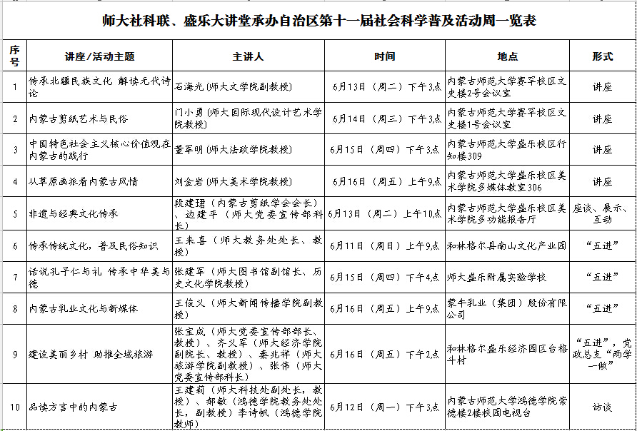 附:师大社科联、盛乐大讲堂承办自治区第十一届社会科学普及活动周安排一览表