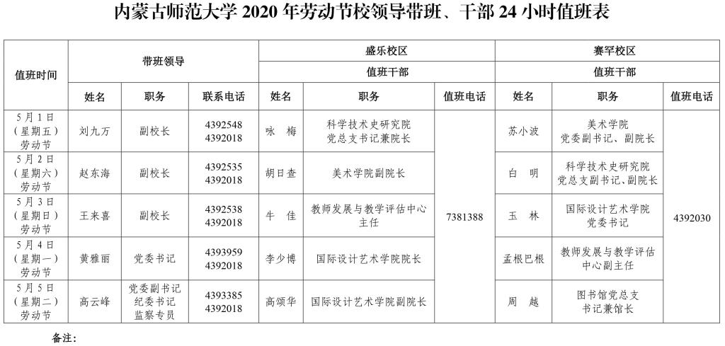3.各学院、各部门要切实做好本单位假期值班工作,安排责任心强、工作认真负责的教职工值班。各单位请于4月29日下午下班前将本单位值班表报党政办公室(盛乐校区行政楼215室,联系人:王一鹤,电话:7383820;赛罕校区田家炳教育书院楼713室,联系人:吴日娜,电话:4392036)和保卫处(盛乐校区创业楼值班室、赛罕校区保卫处楼值班室)。各单位结合自身情况决定本单位值班方式,值班人员要保持通讯畅通,密切关注疫情发展变化,如遇到突发情况要及时上报并妥善处理,并配合学校总值班室做好各项工作。