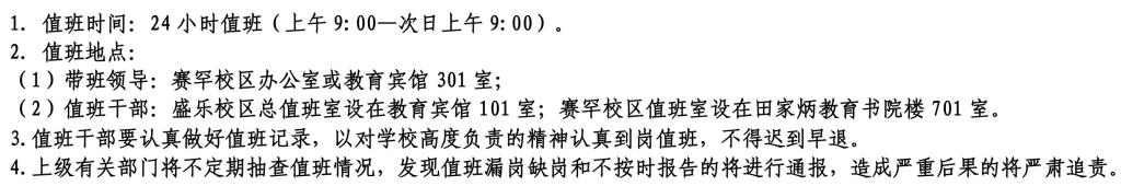 2.学校总值班室实行24小时值班制度,带班校领导要坚持在岗带班,值班干部要24小时在岗值班。值班干部要主动关注两校区动态,做好疫情防控工作,如遇突发情况要第一时间上报带班校领导并及时有效处理。