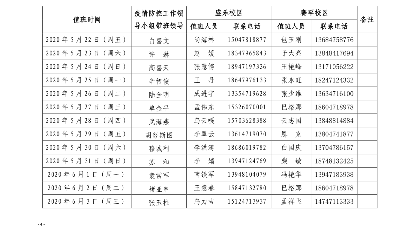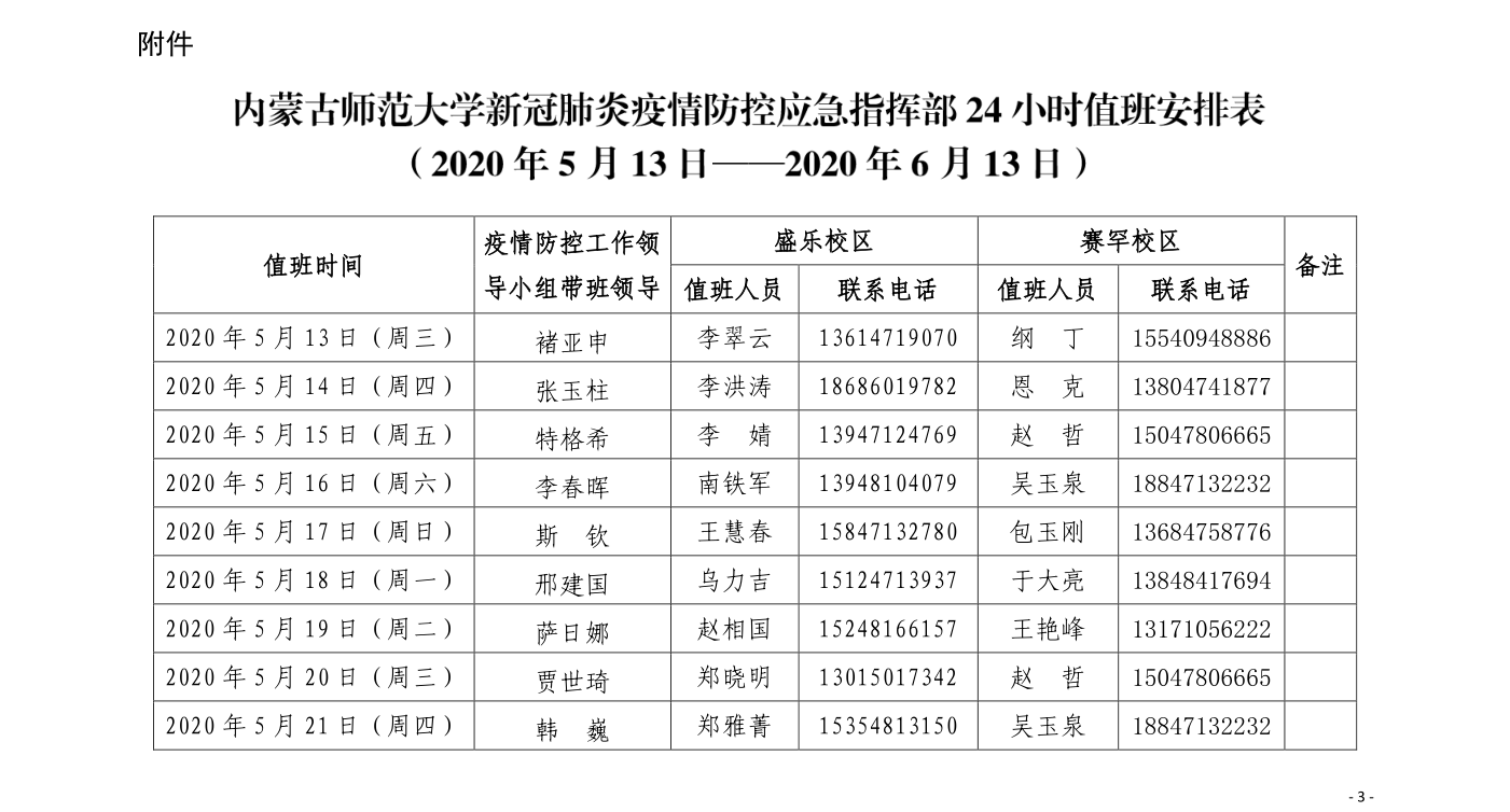 根据学校新冠肺炎疫情防控工作的要求和总体安排,决定从2020年5月13日起,在两校区设立新冠肺炎疫情防控应急指挥部24小时总值班室,总值班由学校新冠肺炎疫情防控工作领导小组成员带班,盛乐校区值班人员由学工部(学生工作处)、团委机关干部组成,赛罕校区值班人员由保卫处工作人员组成。现将具体事宜通知如下:
