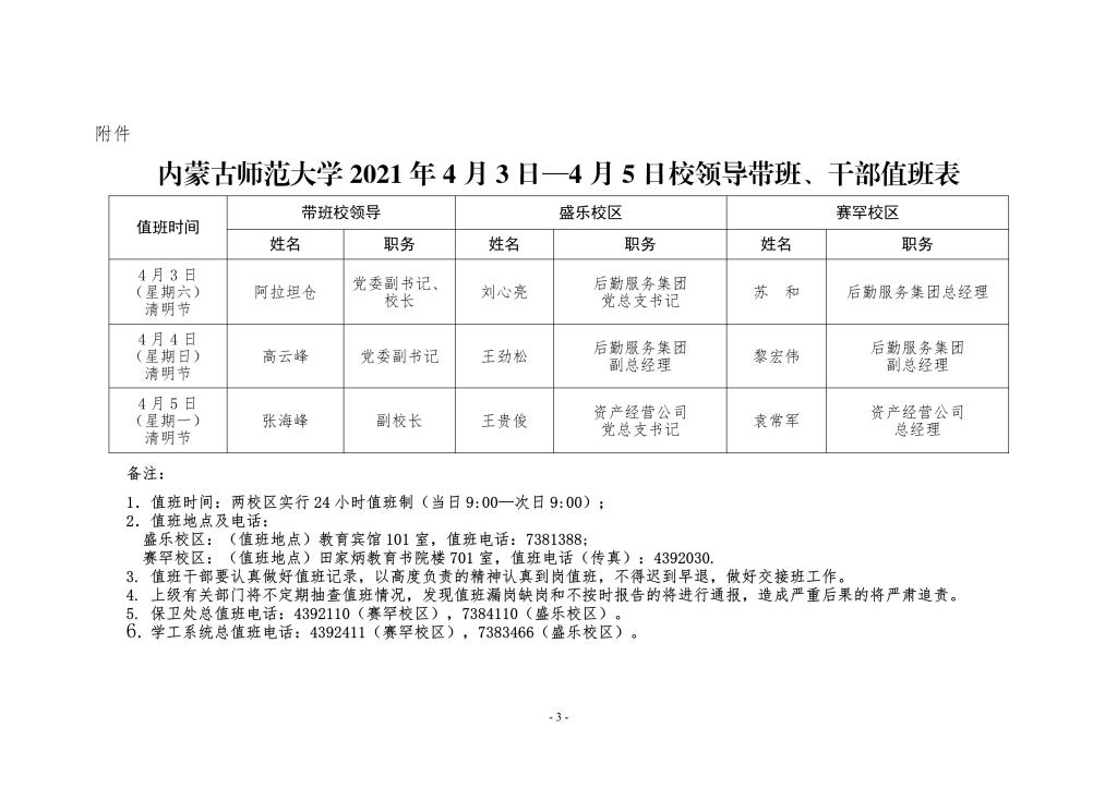 3.清明节期间,各学院、各部门要严格落实本单位值班工作。各单位务于4月1日下午下班前将本单位值班表报党政办公室(盛乐校区行政楼212室,联系人:刘一雄,电话:7383723;赛罕校区田家炳教育书院楼713室,联系人:张妍,电话:4392036)和保卫处(盛乐校区创业楼值班室、赛罕校区保卫处楼值班室)。值班人员要保持通讯畅通,如遇到突发情况要及时上报并妥善处理,并配合学校总值班室做好各项工作。