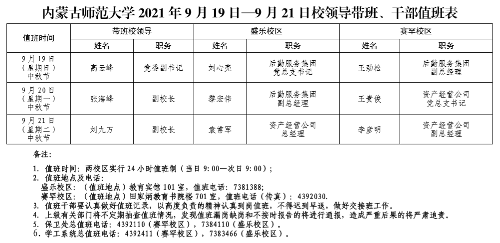 2.假期期间,各学院、各部门要严格落实本单位值班工作。各单位务于9月18日下午下班前将本单位值班表报党政办公室(盛乐校区行政楼212室,联系人:刘一雄,电话:7383723;赛罕校区田家炳教育书院楼713室,联系人:张妍,电话:4392036)和保卫处(盛乐校区创业楼值班室、赛罕校区保卫处楼值班室)。值班人员要保持通讯畅通,如遇到突发情况要及时上报并妥善处理,并配合学校总值班室做好各项工作。