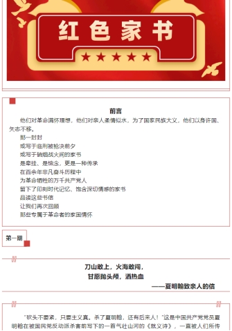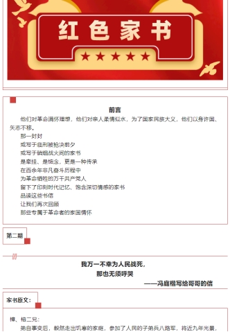 一封封家书纸短情长,一段段历史刻骨铭心。《夏明翰写给亲人的信》,充分展现了革命先烈为国家和人民抛头颅、洒热血,不畏艰难,不惧牺牲的崇高精神;《冯庭楷写给亲人的信》,传递着他希望家人及后人为革命真理和共产主义事业继续奋斗的心愿;《黄继光写给母亲的信》体现了志愿军战士在战斗中为人民服务,不立功不下战场的决心;《陈觉写给妻子赵云霄的信》将陈觉对妻子的深情和对处于水深火热中的祖国深沉的爱展现的淋漓尽致;……