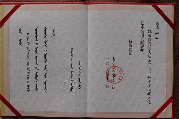 12月23日,在我国卓越的民族工作领导人乌兰夫诞辰110周年之际,第五届、第六届乌兰夫基金民族文化艺术奖颁奖典礼在内蒙古自治区人民会堂举行。美术学院奥迪教授获得第五届乌兰夫基金民族文化艺术突出贡献奖。