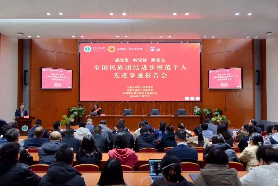 本网讯 11月20日,全国民族团结进步模范个人先进事迹报告会在我校举行。全国民族团结进步模范个人、呼和浩特市回民区通道街三顺店社区党委书记、居委会主任李一芝,全国民族团结进步模范个人、内蒙古大学铸牢中华民族共同体意识研究基地首席专家何生海为我校师生作先进事迹报告。党委副书记斯钦及相关部门主要负责同志,各学院有关负责同志、师生代表参加报告会。党委委员、统战部部长吴爱华主持报告会。