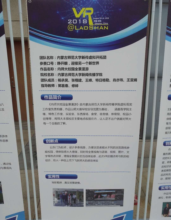 新闻传播学院讯10月23日,第一届国际虚拟现实技术及应用创新大赛在青岛落幕。由我校新闻传播学院杨承昊、张楷建、王峰、特日格勒、肖亦玮、王亚娟等同学组成的内师大新传虚拟开拓团,在郭喜春、修婷老师的指导下,以作品“VR全景导览‘内师大全景漫游’”参赛。该参赛作品在与来自全国高校80多个代表队的250余件作品的角逐中,荣获三等奖。(参赛作品链接:vr.xwcb.site)