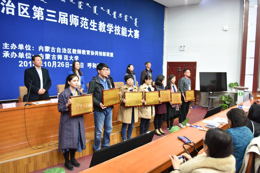 大赛闭幕式在我校信息楼报告厅举行。闭幕式由本次大赛评委会副主任、我校教师发展与教学评估中心副主任孟根巴根主持。闭幕式上,徐月琴和王允山两位评委就参赛选手表现进行了点评,集宁师范学院教师郭志清代表指导教师作了发言,内蒙古民族大学教务处副处长陈永春代表领队作了发言。本届大赛评委会副主任田振清对选手总体表现进行了点评。内蒙古自治区教师教育协同创新联盟秘书长、我校教师徐宝芳对本次大赛进行了总结。经过评委会的评审,评选出优秀选手一等奖13名、二等奖22名、三等奖35名、优秀奖42名,优秀指导教师53名,优秀组织奖7个。