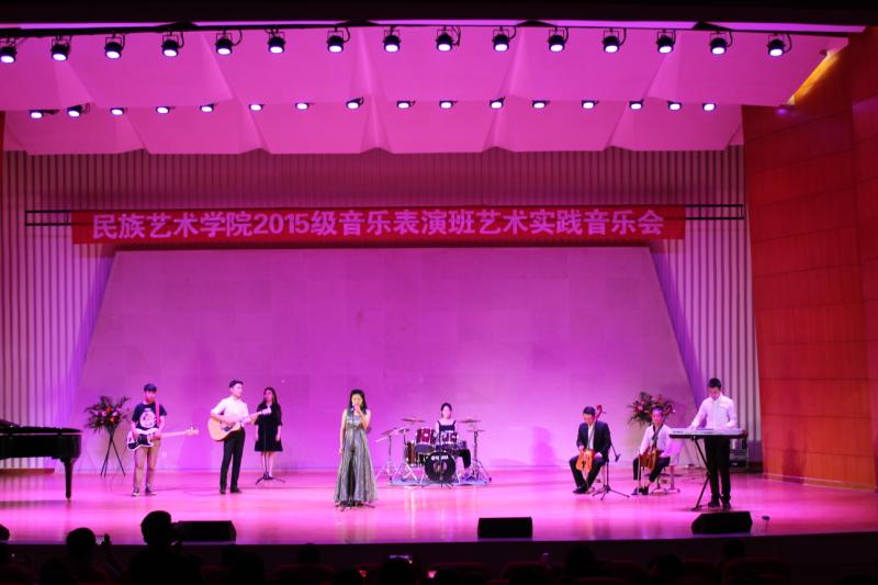 民族艺术学院讯6月8日晚,民族艺术学院2015级音乐表演班艺术实践音乐会在该院音乐厅举办。整场音乐会节目丰富多彩,其中包括民乐队与三弦、钢琴独奏、美声独唱、重唱、蒙古族长调、器乐独奏、电声乐队、班级合唱等,所有节目都由2015级音乐表演班同学完成。