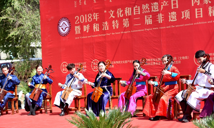 本网讯(文/图 边辑)6月9日上午,2018年“文化和自然遗产日”内蒙古自治区主场活动暨呼和浩特第二届非遗项目精品展示展销会活动在呼和浩特市莫尼山非遗小镇举办。应呼和浩特市非物质文化遗产保护中心邀请,betway精英版 文化产业发展研究中心组织我校音乐学院的9名马头琴专业的大学生参加了活动开幕式表演,并观摩和参与了非遗精品展示活动。