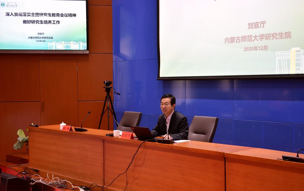 研究生院负责人刘官厅从研究生教育管理的角度,解读了全国研究生教育大会相关精神和我校研究生教育培养相关文件精神,并结合自身经历,就如何培养研究生的研究能力等方面提出建议。