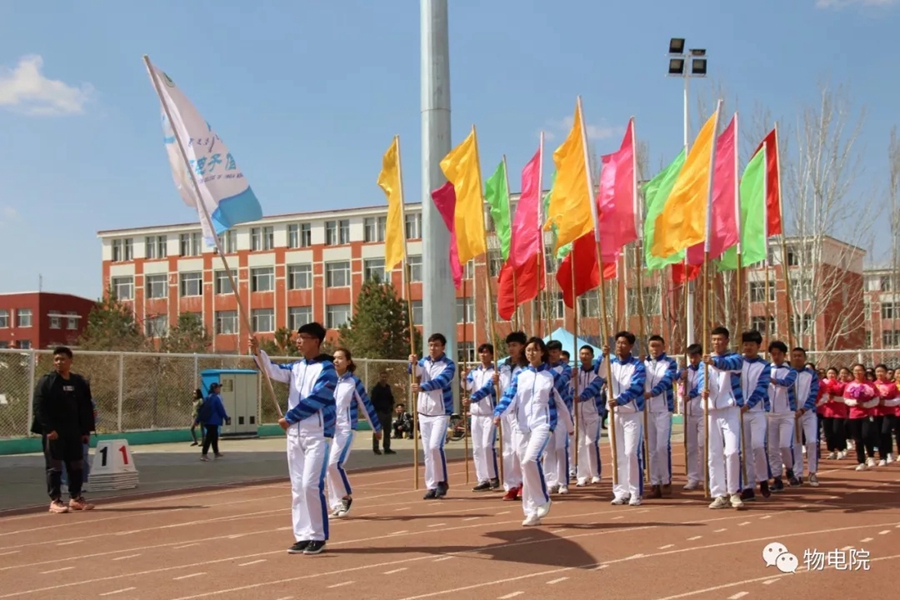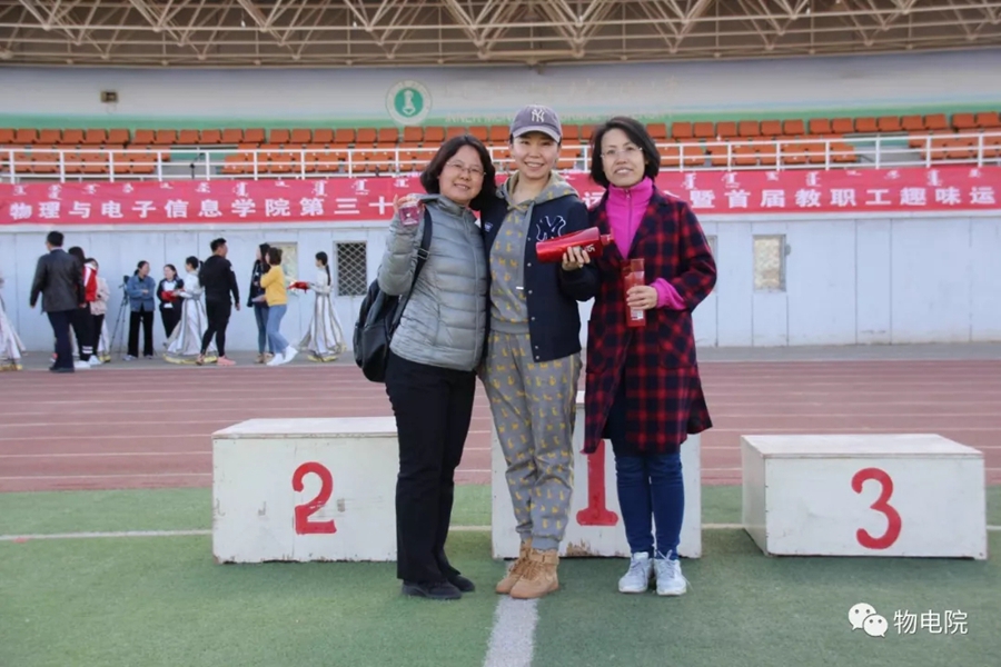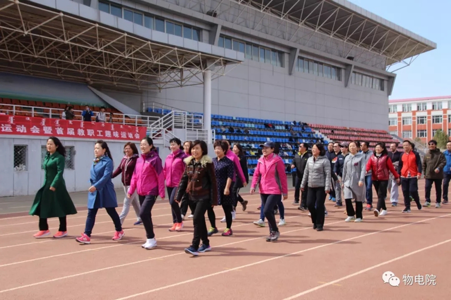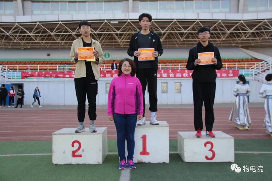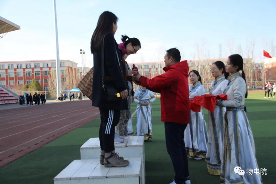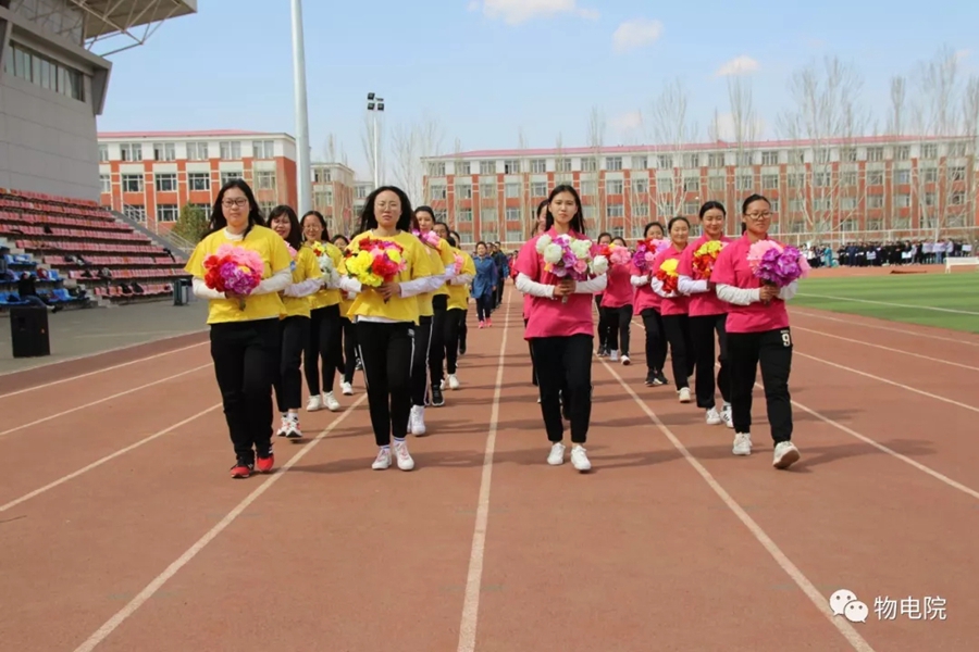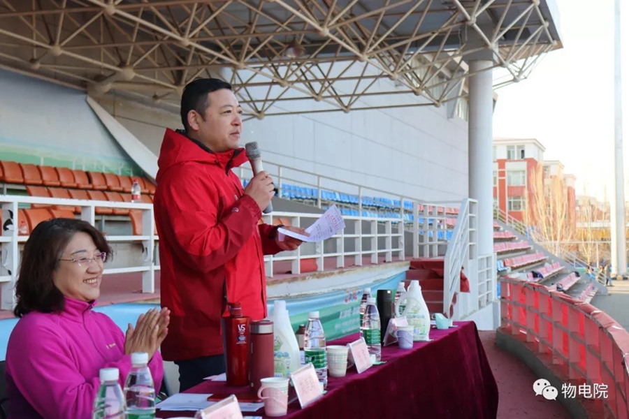 本网讯:为增添校园文化活力,锻炼学生身心、培养学生团结合作的能力,同时也为了丰富教职工的业余文化生活,4月11日,我院于盛乐校区东操场举行物理与电子信息学院第三十届田径运动会暨首届教职工趣味运动会。学院党总支书记刘美玲,党总支副书记兼副院长张伟,副院长那日苏,学院系、办、中心、团总支、学就办老师,各班班主任、全院教职工以及学院本硕学生700余人参加了本届运动会。下午两点,运动会在激昂的音乐中拉开序幕。首先,英姿飒爽的国旗队踏着整齐而坚定的步伐向主席台走来。紧接着,彩旗队、花束队、教职工方阵、运动员代表方阵排成整齐的队列,齐声高喊口号,依次走过主席台。在运动员代表、裁判员代表庄严宣誓后,学院党总书记刘美玲致开幕词,她强调了举办运动会的重要意义,并祝愿每位师生运动员能够不负期望,取得佳绩。比赛正式开始,参赛运动员都精力充沛、为班级荣誉而奋斗着。田赛场上,运动员们轻盈地跃过跳杆,他们骄傲地掠过沙地;短跑赛道上,他们像离弦的箭一般势不可当;接力比赛中,每个人都竭尽全力、精诚配合,在接棒擦肩而过的瞬间默契地相视而笑;5000米赛道上,他们持之以恒、永不言弃的精神感染着在场的每一位同学,大家齐声为他们呐喊欢呼……与此同时,教职工趣味运动会比赛项目也在操场中央进行着。两人三足、带球障碍跑……各种有趣的比赛吸引了很多老师积极参与。平时在讲台上严肃认真的老师们都大显身手,玩得不亦乐乎。精彩的比赛吸引了很多学生的围观,都为老师们加油鼓劲。经过一下午的激烈比拼,本次运动会的全部比赛项目顺利结束。闭幕式上,张伟副书记宣布最终成绩:18级物理蒙班、17级物理蒙班、16级电子信息工程班获得团体总成绩前三名。随后,那日苏副院长致闭幕词,刘美玲书记代表学院向国旗护卫队授予锦旗。至此,本届运动会圆满结束。本次运动会的举办使学生迎接挑战的意志和承担风险的能力得到了充分展现,也培养了同学们的竞争意识、协作精神和公平观念。同时,也为平时辛苦工作的老师们提供了休闲放松、与同学们亲密接触的机会。运动会的成功举办也离不开工作人员的辛勤付出,他们付出了很多,但收获和自豪更多!