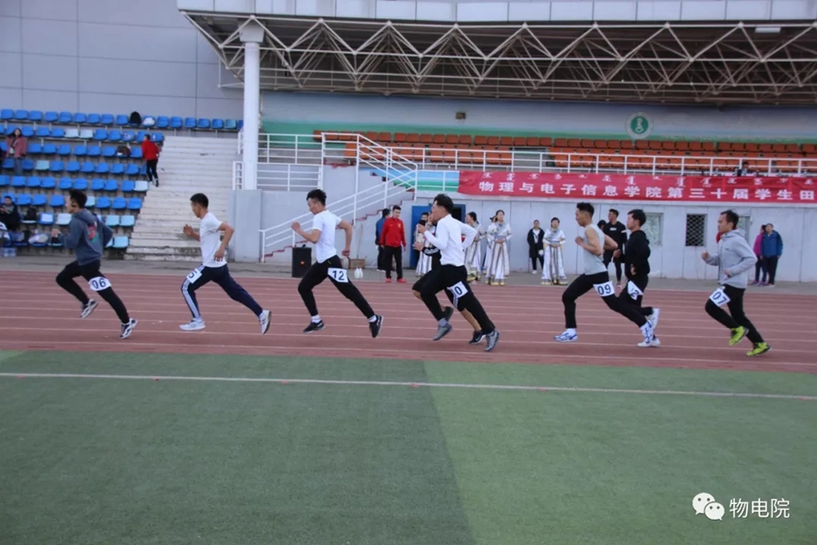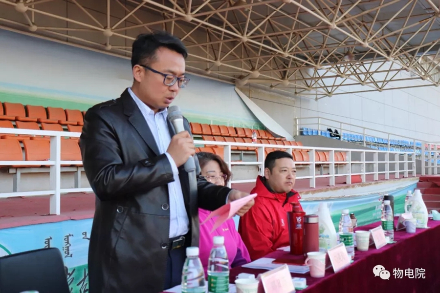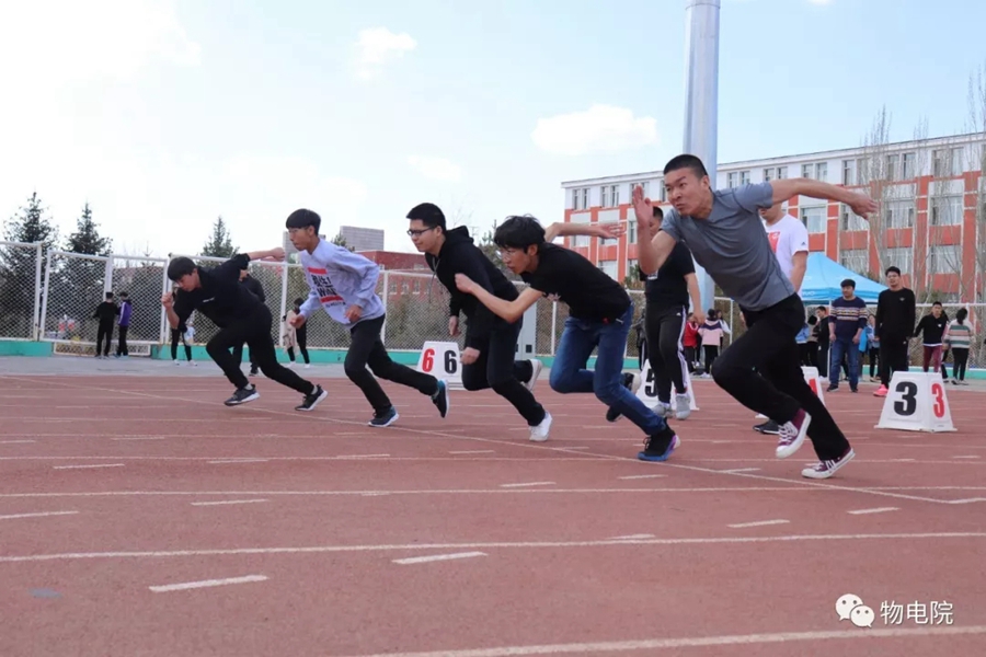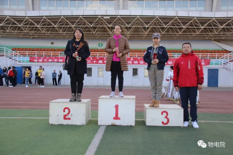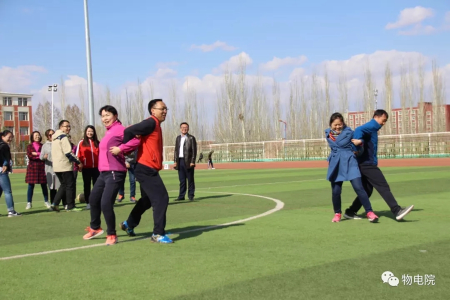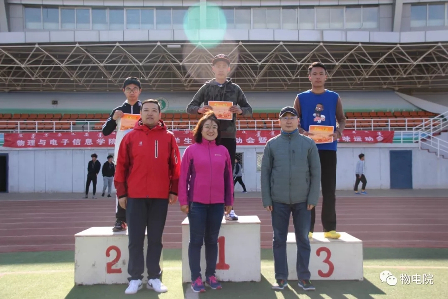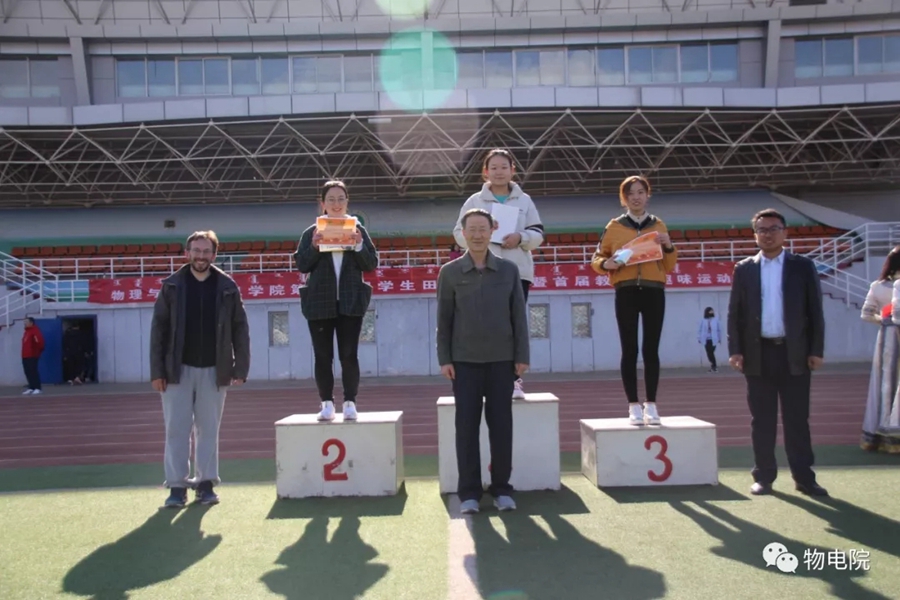 本网讯:为增添校园文化活力,锻炼学生身心、培养学生团结合作的能力,同时也为了丰富教职工的业余文化生活,4月11日,我院于盛乐校区东操场举行物理与电子信息学院第三十届田径运动会暨首届教职工趣味运动会。学院党总支书记刘美玲,党总支副书记兼副院长张伟,副院长那日苏,学院系、办、中心、团总支、学就办老师,各班班主任、全院教职工以及学院本硕学生700余人参加了本届运动会。下午两点,运动会在激昂的音乐中拉开序幕。首先,英姿飒爽的国旗队踏着整齐而坚定的步伐向主席台走来。紧接着,彩旗队、花束队、教职工方阵、运动员代表方阵排成整齐的队列,齐声高喊口号,依次走过主席台。在运动员代表、裁判员代表庄严宣誓后,学院党总书记刘美玲致开幕词,她强调了举办运动会的重要意义,并祝愿每位师生运动员能够不负期望,取得佳绩。比赛正式开始,参赛运动员都精力充沛、为班级荣誉而奋斗着。田赛场上,运动员们轻盈地跃过跳杆,他们骄傲地掠过沙地;短跑赛道上,他们像离弦的箭一般势不可当;接力比赛中,每个人都竭尽全力、精诚配合,在接棒擦肩而过的瞬间默契地相视而笑;5000米赛道上,他们持之以恒、永不言弃的精神感染着在场的每一位同学,大家齐声为他们呐喊欢呼……与此同时,教职工趣味运动会比赛项目也在操场中央进行着。两人三足、带球障碍跑……各种有趣的比赛吸引了很多老师积极参与。平时在讲台上严肃认真的老师们都大显身手,玩得不亦乐乎。精彩的比赛吸引了很多学生的围观,都为老师们加油鼓劲。经过一下午的激烈比拼,本次运动会的全部比赛项目顺利结束。闭幕式上,张伟副书记宣布最终成绩:18级物理蒙班、17级物理蒙班、16级电子信息工程班获得团体总成绩前三名。随后,那日苏副院长致闭幕词,刘美玲书记代表学院向国旗护卫队授予锦旗。至此,本届运动会圆满结束。本次运动会的举办使学生迎接挑战的意志和承担风险的能力得到了充分展现,也培养了同学们的竞争意识、协作精神和公平观念。同时,也为平时辛苦工作的老师们提供了休闲放松、与同学们亲密接触的机会。运动会的成功举办也离不开工作人员的辛勤付出,他们付出了很多,但收获和自豪更多!
