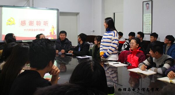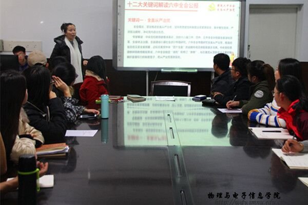 本网快讯党的十八届六中全会在10月27日胜利闭幕。为了更好的领会和贯彻十八届六中全会精神,2016年11月28日,我院于物电楼会议室召开了以“深入学习贯彻十八届六中全会精神”为主题的学习大会。团总支书记萨其尔老师,学工办苏雅拉、塔林托亚老师,以及学院学生骨干分子参加本次会议,并由萨其尔老师主持。