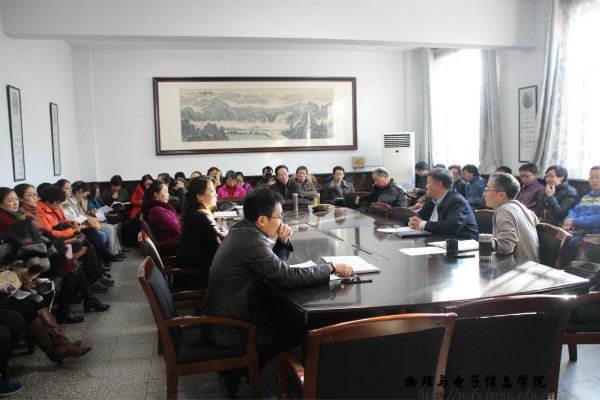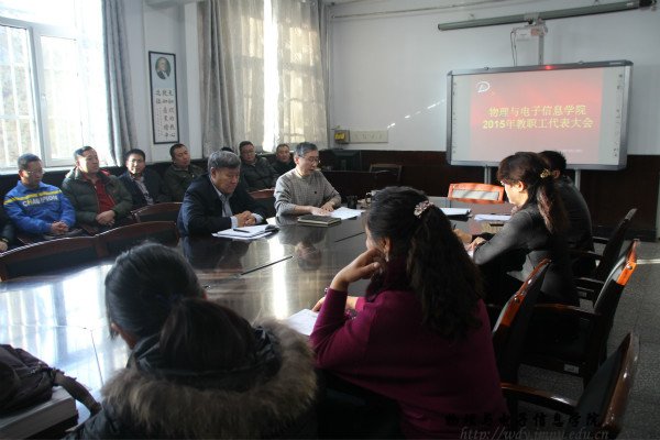 本网讯2015年12月10日下午,我院在物理楼一楼会议室召开了全体教职工代表大会,出席会议的有我院院长特古斯教授,党总支副书记何小龙老师,副院长吉日嘎拉教授,副院长刘美玲老师等领导老师,并邀请了部分已退休的老教师。大会上,特院长对我院现状和近几年发展情况进行了简要的概述。其中就我院的教学环境,本科生及研究生教育,毕业生发展等做出了客观的总结,并以前段时间的教学审核评估后教育部对我院提出的建议为基准对我院的未来发展做出了整体的规划。同时我院参与了盛乐校区的教学楼以及宿舍楼的划分的工作而且取得了好的成效。会议中各位老师也纷纷发表了意见,以最大限度去改善我院现有教学水平及学术发展为目标而努力。此次会议的召开,使各位教职工对我院的发展情况有了更加深入的了解,并从自身做起为物电院的发展而共同努力。