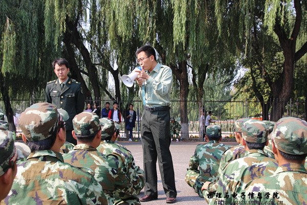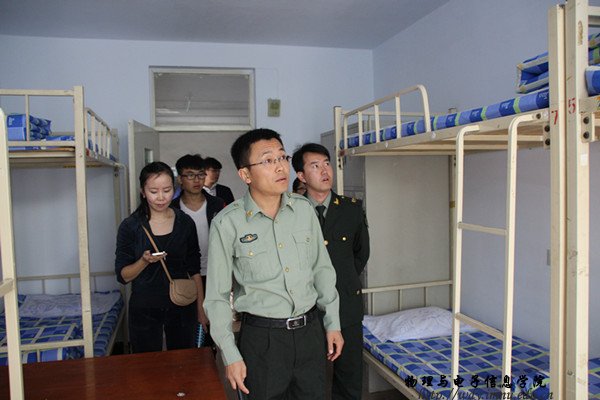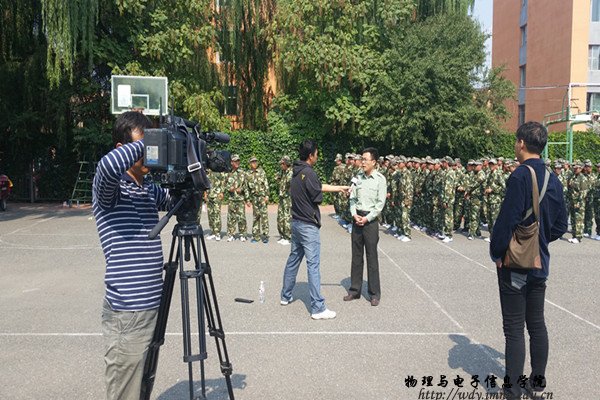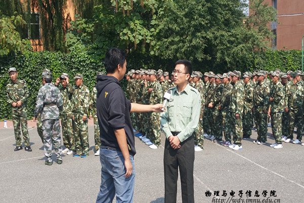 本网讯2015年9月15日上午,我院党总支副书记何小龙老师、团总支萨其尔老师和学工办宋志强老师对我院15级新生的军训情况进行了全面的视察。首先,老师们来到了新生宿舍,查看了每个宿舍的内务情况。期间,何老师明确指出了新生内务的问题所在。随后,老师们来到了新生的军训场地,何老师深入队伍,鼓励新生们积极完成军训任务,并就内务所出现的问题做出了明确的指示和指导,督促新生改正问题,精益求精。最后,内蒙古卫视的记者对何老师和几位参训同学进行了采访,访问中,何老师表示军训是大学生成长成才的起点,是人生中宝贵的经历,相信我院新生一定能够圆满的完成军训任务!