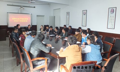 本网讯2014年3月19日下午3时,我院于物电楼会议室召开新学期学生干部座谈会。我院党总支副书记何小龙老师、团总支萨其尔老师、学工办宋志强老师以及学生会主席团和11-14级各班班长出席本次会议。