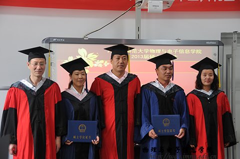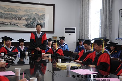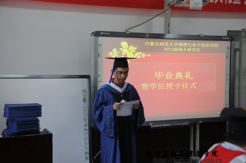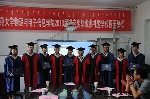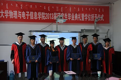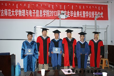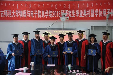 7 月3日 上午,我院在物理楼会议室隆重召开2013届研究生毕业典礼暨学位授予仪式大会。物理与电子信息学院党总支书记阿梅老师、院长特古斯教授、图书馆馆长萨楚尔夫教授、副院长吉日嘎拉教授、党总支副书记何小龙老师参加本次大会。出席典礼的还有我院导师代表和2013届研究生毕业同学。会议由副院长吉日嘎拉教授主持。