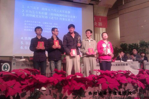 侯琛、郝俊彪、马骁、李毅斌、孟文斌等五位同学代表我院参加此次比赛。经过必答题、抢答题、互动题和演绎题四个环节的比拼,我院最终获得了优秀奖。