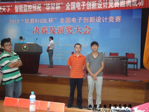 ,2012“毕昇RIGOL杯”全国电子创新设计竞赛决赛在北京理工大学落下帷幕。我院张丽娜老师带领由09级工程(1)班阿木古楞、王维组成的参赛队代表我校参赛。在决赛中,参赛队表现优异,最终荣获全国总决赛团体二等奖。