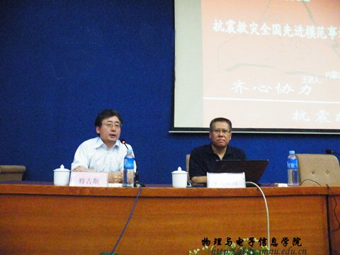 在讲座会上,卓力格图校友为大家讲述了自己在抗震前线的所见所闻。据了解,汶川大地震发生以后,内蒙古消防支队、市卫生系统、市供电局、市建设部门等各个部门,迅速组织抗震救灾力量,奔赴前线。除了这些抗震英雄奋战在灾区第一线外,内蒙古人民踊跃捐款捐物,为灾区同胞奉献自己的一份爱心。他的报告感人肺腑、催人奋进,集中体现了各级党组织和广大共产党员在抗震救灾中可歌可泣的壮举和感天动地的崇高精神,强烈地震撼着现场每一个人的心灵。不少同学听后潸然泪下,现场响起了经久不息的掌声。