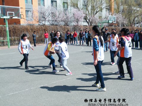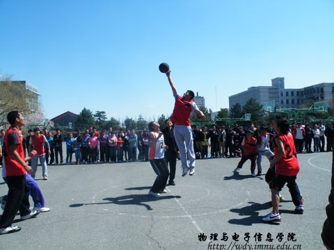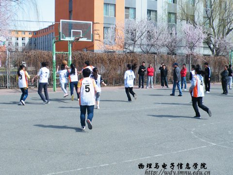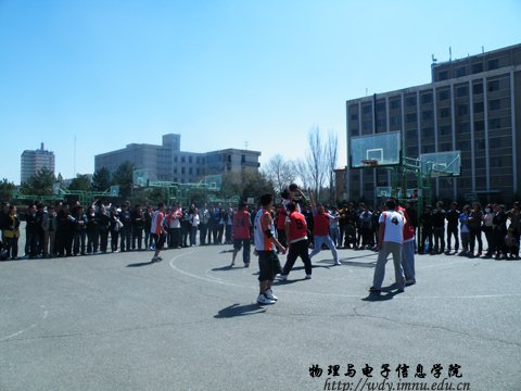 2012年4月14日和15日,我院在篮球场分别参加校级篮球赛半决赛、决赛,参加半决赛的队伍是,女子组:物理与电子信息学院对战化学与环境科学学院;男子组:计算机学院对战物理与电子信息学院。参加决赛的队伍是:女子组:10:00生命科学与技术学院对战物理与电子信息学院;男子组:音乐学院对战物理与电子信息学院。比赛在同学们激扬的欢呼声中准时开始。
