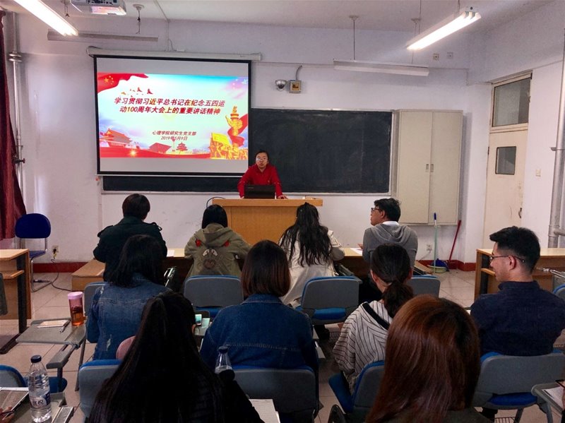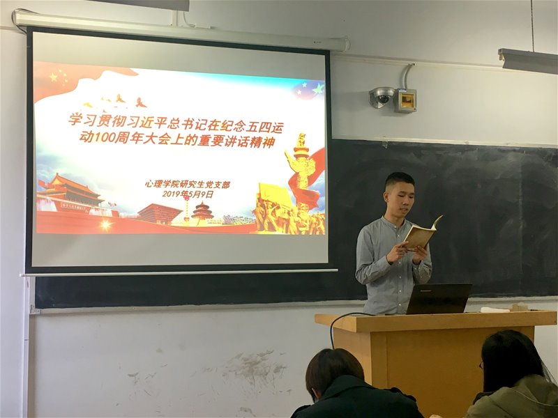 今天心理学院研究生党支部大会召开题为“学习贯彻习近平总书记在纪念五四运动100周年大会上的重要讲话精神”的会议,目的是希望心理学院党支部青年学子接过历史的接力棒,勇立新时代潮头。畅谈如何将习近平总书记的殷切期盼和嘱托落实到日常生活学习和工作当中,不忘初心、志存高远,为实现中华民族伟大复兴的中国梦贡献力量。