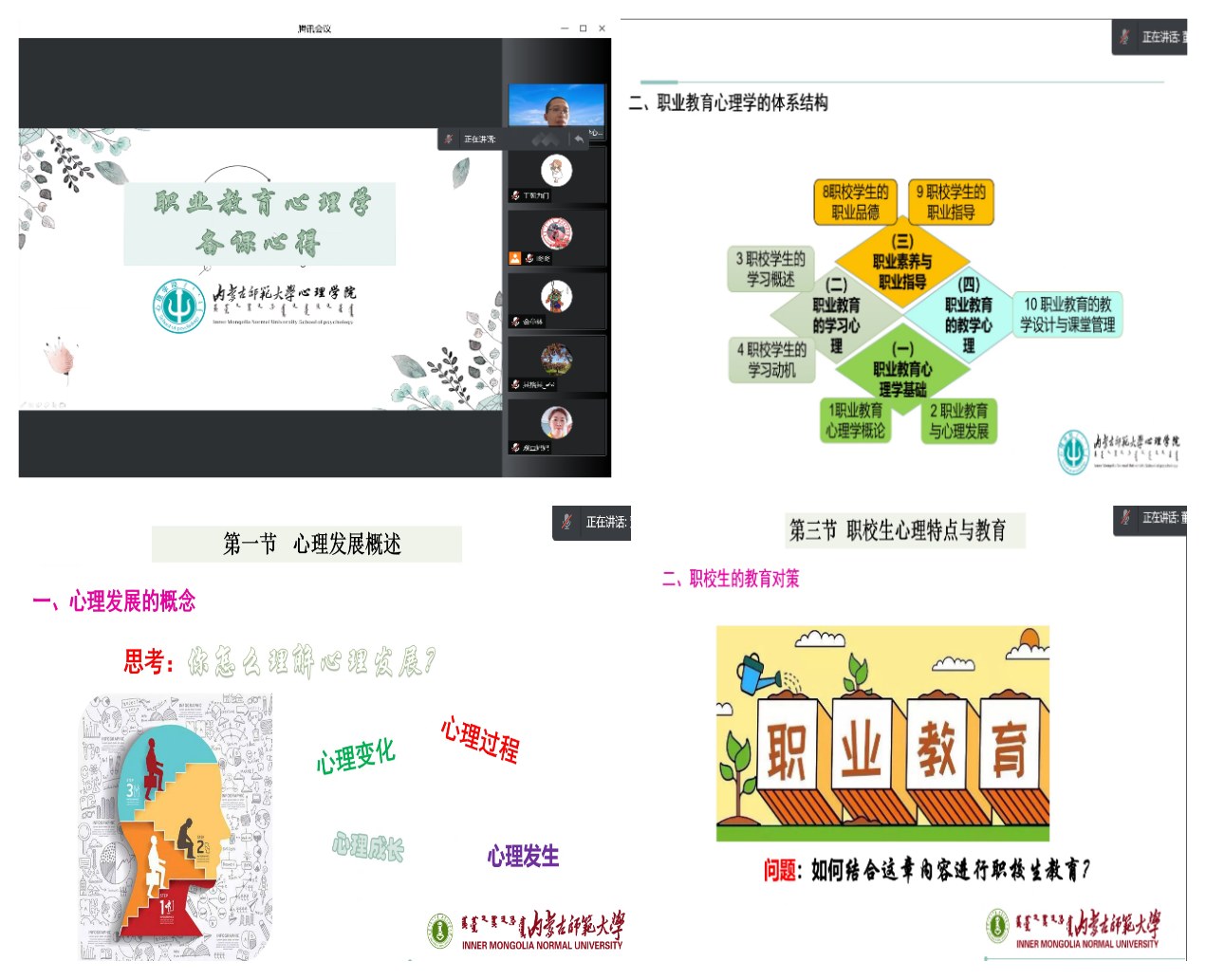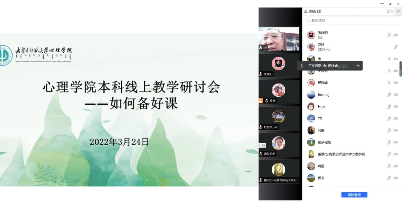 为了进一步提升线上教学效果,促进本科教学质量,3月24日下午,在各教研室充分开展线上教学研讨的基础上,心理学院召开“如何备好课”——本科线上教学研讨会。学院党委书记七十三、院长乌云特娜、党委副书记张晓阳、副院长侯友及全体教师参加。心理学系主任杨晓峰、中学教育心理学教研室主任解翠玲、职业教育心理学教研室主任董洪杰、心理健康教育教研室主任赵媛分别做了经验交流和分享。