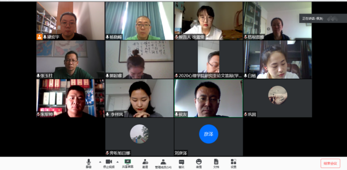 根据本学期教学工作和疫情防控工作的要求,为保证研究生学位论文答辩工作如期完成,我院于5月14日下午3点、5月16日上午8点、5月17日下午2点,使用“腾讯会议”在线上分别举行了2020届博士毕业生预答辩、学术型硕士研究生、专业学位研究生学位论文答辩。答辩分为5组,分别在不同的“云端会议室”中进行。为确保论文线上答辩的公开、真实、完整、可记录,让线上答辩经得住检验,心理学院加强过程性监控和质量督查,确保线上答辩与线下实质等效,各答辩委员会秘书在整个答辩过程都做了录音、录屏,作为答辩记录留存。